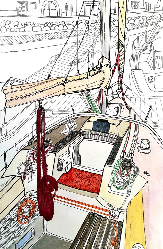 Ouvrage (textes et dessins) sur le tour de l’Atlantique Nord effectué à la voile en 2024-2025. Projet en cours de réalisation